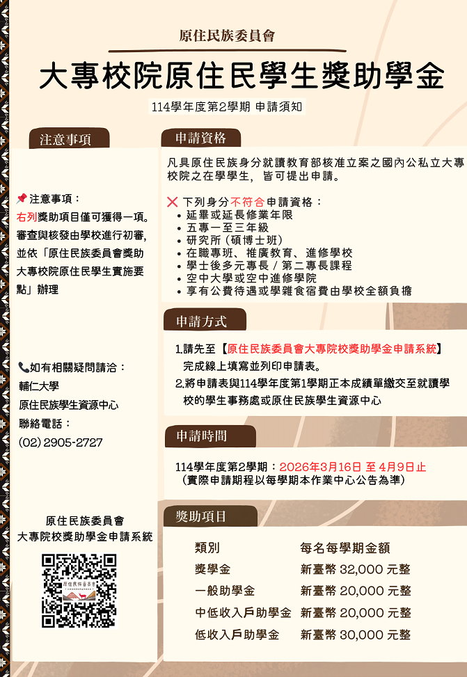 114學年度第2學期「原住民族委員會獎助大專校院原住民學生-獎助學金」申請說明 114學年度第2學期「原住民族委員會獎助大專校院原住民學生-獎助學金」申請須知,請詳閱注意事項。 申請系統: https://cipgrant.fju.edu.tw/ 系統填報時間:115/3/16(一)起至115/4/9(四)23:59止 紙本收件截止:115/4/13(一)17:00 收件地點:台北校區原資中心G107、桃園校區原資中心EE403-1 申請方式: 填寫線上申請資料 → 上傳114-1中文單學期成績單電子檔(PDF檔或JPEG檔) → 列印申請表 →將紙本申請表(表上親自簽名)、114-1正本成績單及中低、低收入戶證明繳交至原資中心 相關附件: 學生操作使用手冊https://drive.google.com/file/d/1lWAJ8is_YyfRTp7h7jGme96kB0Gg-r7v/view?usp=drive_link 原住民族委員會獎助大專校院原住民學生實施要點 https://drive.google.com/file/d/13ZZxExwUsrtiA9XYU0W-0oqoJHS_SxYM/view?usp=sharing